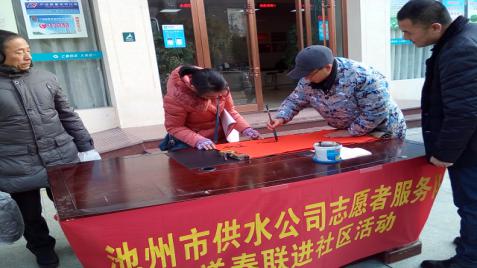 無聯(lián)不成春,有聯(lián)春更濃。為迎接新春佳節(jié),營造喜慶祥和的節(jié)日氣氛,2017年1月17日上午八點半,池州市供水有限公司在客戶服務部客服中心大門前開展了“迎新春、寫春聯(lián)送春聯(lián)”活動,為轄區(qū)居民送去春聯(lián)和新春的祝福。公司特邀請了池州書法協(xié)會會員周先生,在現場為轄區(qū)居民群眾書寫春聯(lián)。