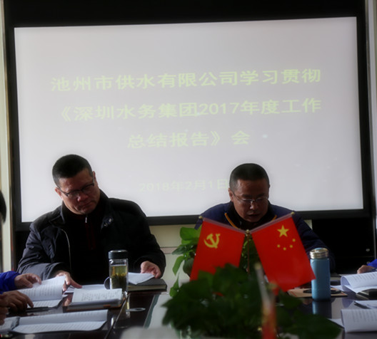 2018年1月29日深圳水務(wù)集團(tuán)公司2017年工作總結(jié)會(huì)議順利召開后,2月1日上午,池州市供水有限公司迅速組織班子成員及各部門負(fù)責(zé)人在公司三樓會(huì)議室集中學(xué)習(xí)深水集團(tuán)黨委書記、董事長胡嘉東所作的《2017年工作總結(jié)報(bào)告》。