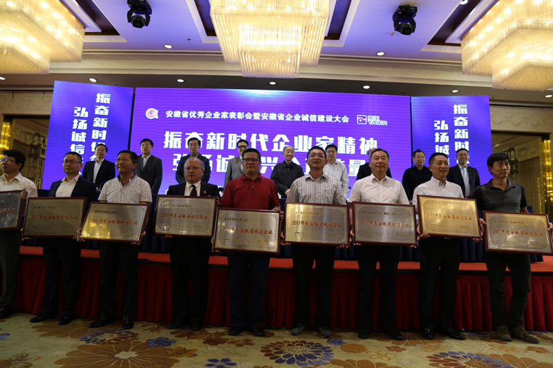 5月10日,安徽省優(yōu)秀企業(yè)家表彰會(huì)暨安徽省企業(yè)誠(chéng)信建設(shè)大會(huì)在馬鞍山市召開,公布并表彰“2017年度安徽省誠(chéng)信企業(yè)”,總經(jīng)理吳小平同志代表公司上臺(tái)領(lǐng)取榮譽(yù)獎(jiǎng)牌。