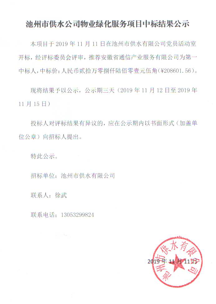 | 池州市供水公司物業(yè)綠化服務(wù)項目中標(biāo)結(jié)果公示 | |