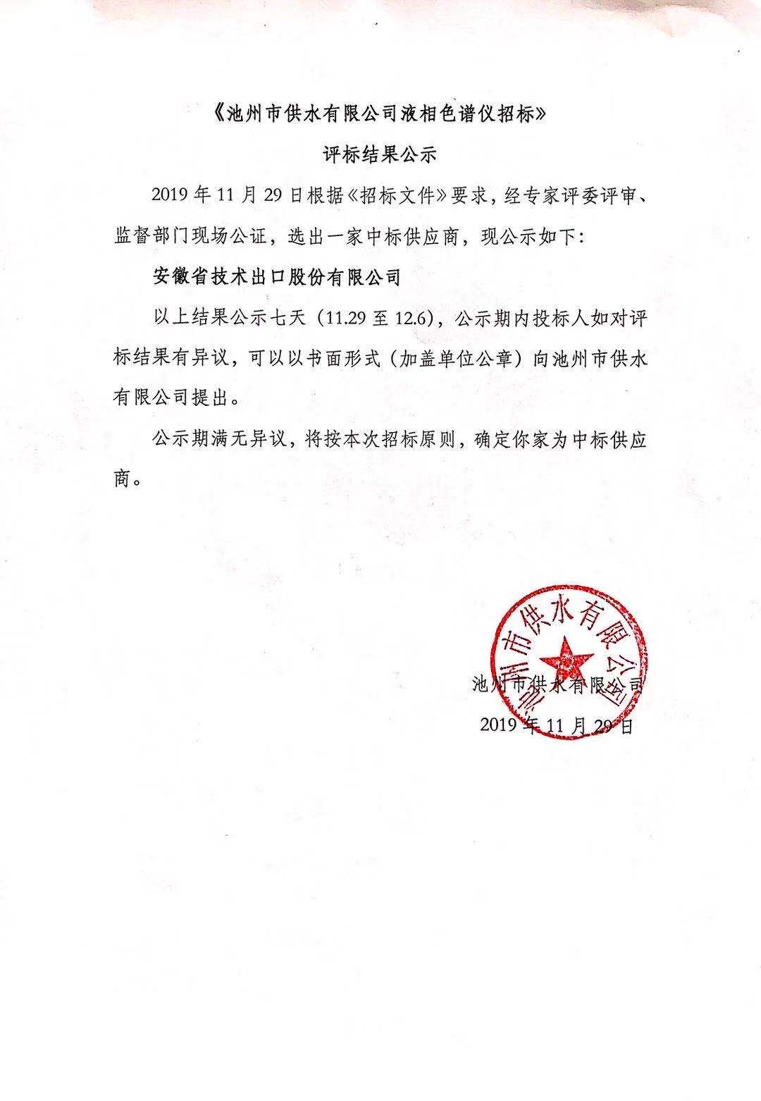 | 《池州市供水有限公司液相色譜儀招標(biāo)》評(píng)標(biāo)結(jié)果公示 | |