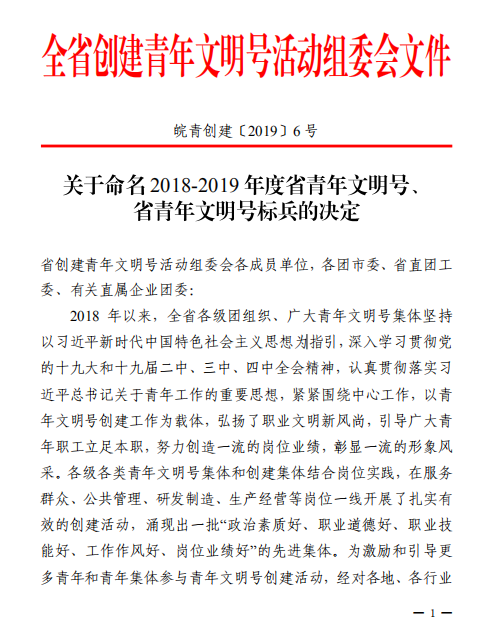 近日,安徽省青年文明號(hào)創(chuàng)建活動(dòng)組委會(huì)傳來(lái)喜訊,池州市供水有限公司客服中心集體榮獲 2018-2019 年度“省青年文明號(hào)”、城東供水管理所青年集體為 2018-2019 年度“省青年文明號(hào)標(biāo)兵”榮譽(yù)稱號(hào)。