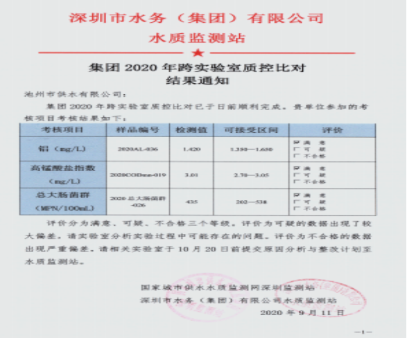 為加強(qiáng)集團(tuán)各實驗室檢測隊伍能力建設(shè),提高化驗室的檢測數(shù)據(jù)的有效性和可比性,并及時發(fā)現(xiàn)可能存在的問題,深圳水務(wù)集團(tuán)于8月份對轄下73家實驗室開展了2020年跨實驗室質(zhì)控比對考核。本次考核項目為:鋁、高錳酸鹽指數(shù)及總大腸菌群。池州市供水有限公司水質(zhì)檢測中心在本次供水實驗室三類項目考核中均取得優(yōu)異成績。