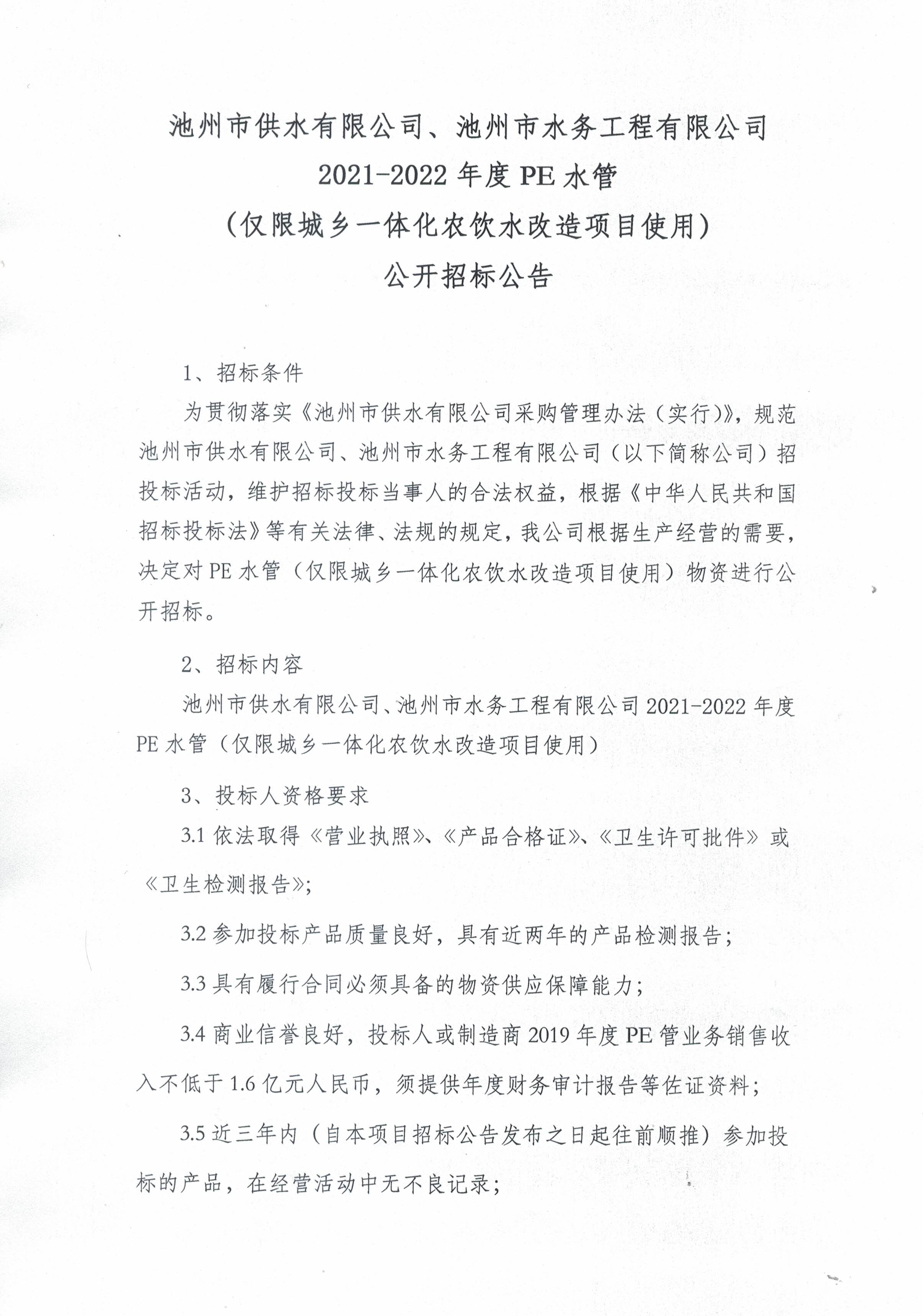 | 池州市供水有限公司、池州市水務(wù)工程有限公司.2021-2022年度PE水管(僅限城鄉(xiāng)一體化農(nóng)飲水改造 | |