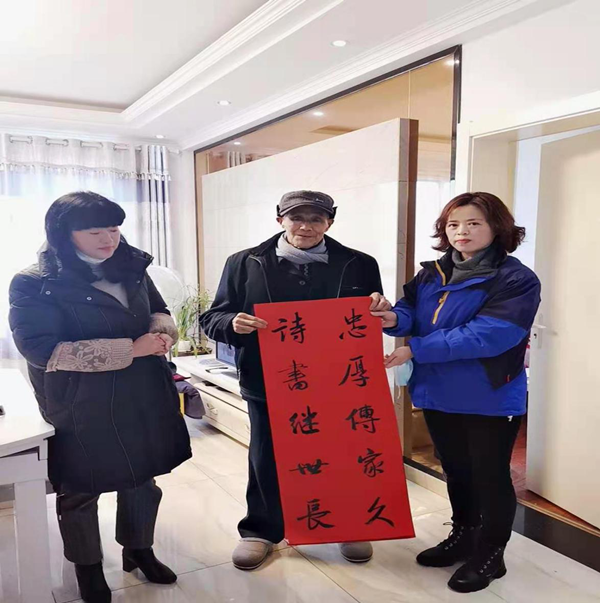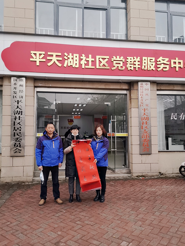 平天湖社區(qū)是供水公司多年文明創(chuàng)建共建單位,送春聯(lián)的第一站,施潔主席一行就選擇了和諧共建、關(guān)系融洽的平天湖社區(qū)。胡桂珍書記她們?cè)缭绲卦陂T口迎接,熱情洋溢地表達(dá)對(duì)公司的感謝和共建愉悅之情。“供水公司太有心了,每年都請(qǐng)人手寫對(duì)聯(lián),送到我們社區(qū),社區(qū)居民有福了,大家都很喜歡這手寫對(duì)聯(lián),感謝供水公司愛(ài)心!,胡書記如是說(shuō)。