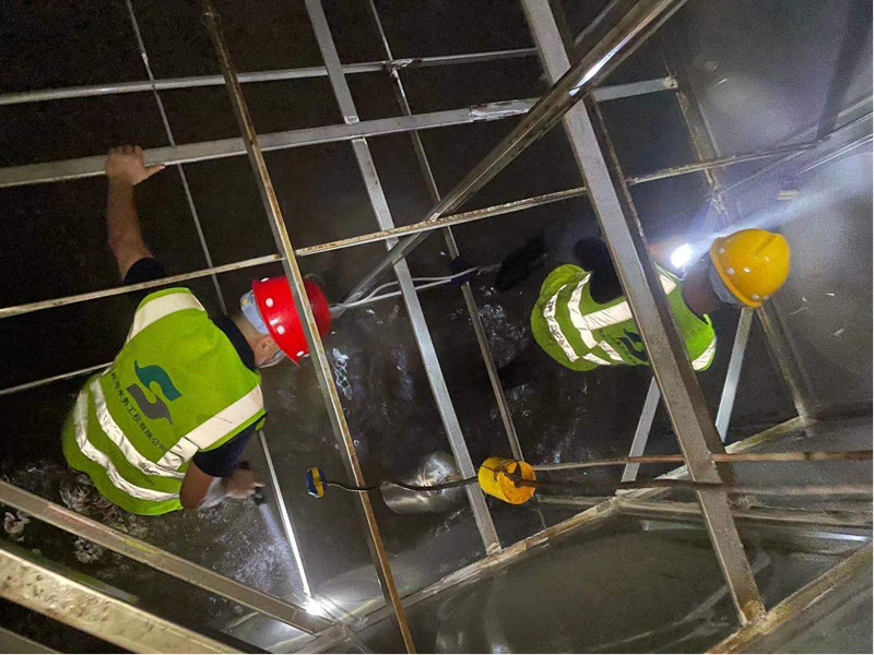G318墩上收費(fèi)站的泵房已有較長(zhǎng)時(shí)間未進(jìn)行專業(yè)清洗消毒,泵房不銹鋼水箱體積較大。為保證有限空間作業(yè)安全,黨員志愿者們通過(guò)對(duì)水箱內(nèi)部通風(fēng)換氣等方式,在保障水箱內(nèi)部安全的前提下,用水槍對(duì)水箱內(nèi)壁進(jìn)行反復(fù)清洗、排放、消毒。在志愿者們的努力下,徹底將不銹鋼水箱清洗干凈,并將清洗情況詳細(xì)告知收費(fèi)站管理人員,指導(dǎo)他們泵房日常維護(hù)保養(yǎng)和清洗消毒方面的知識(shí),確保日常飲用水安全。