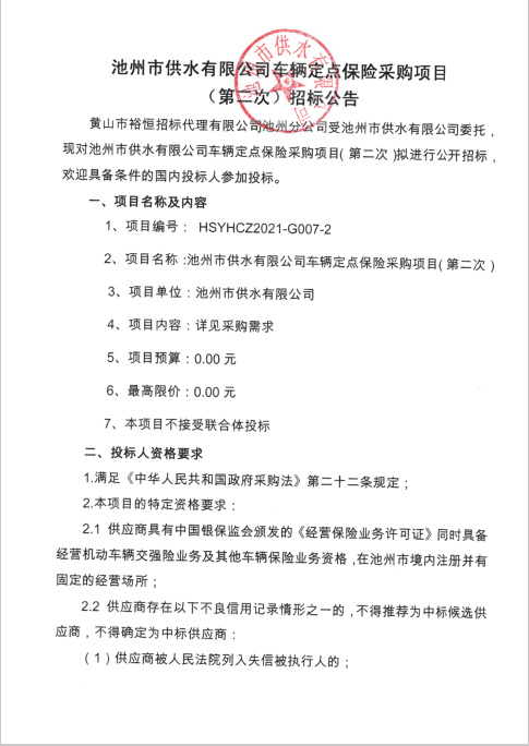 | 池州市供水有限公司車輛定點保險采購項目(第二次)招標公告次) | |