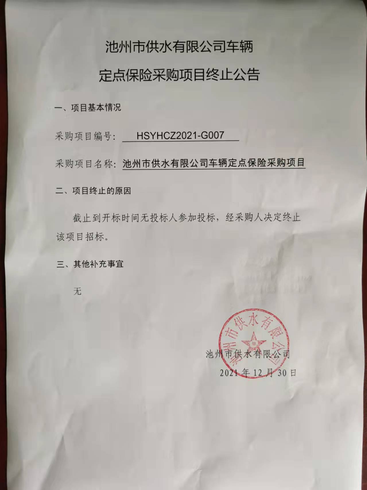 | 池州市供水有限公司車輛定點(diǎn)保險采購項(xiàng)目終止公告 | |