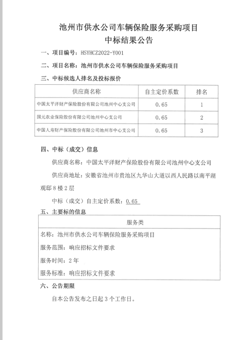 | 池州市供水有限公司車輛保險(xiǎn)服務(wù)采購(gòu)項(xiàng)目中標(biāo)結(jié)果公示 | |