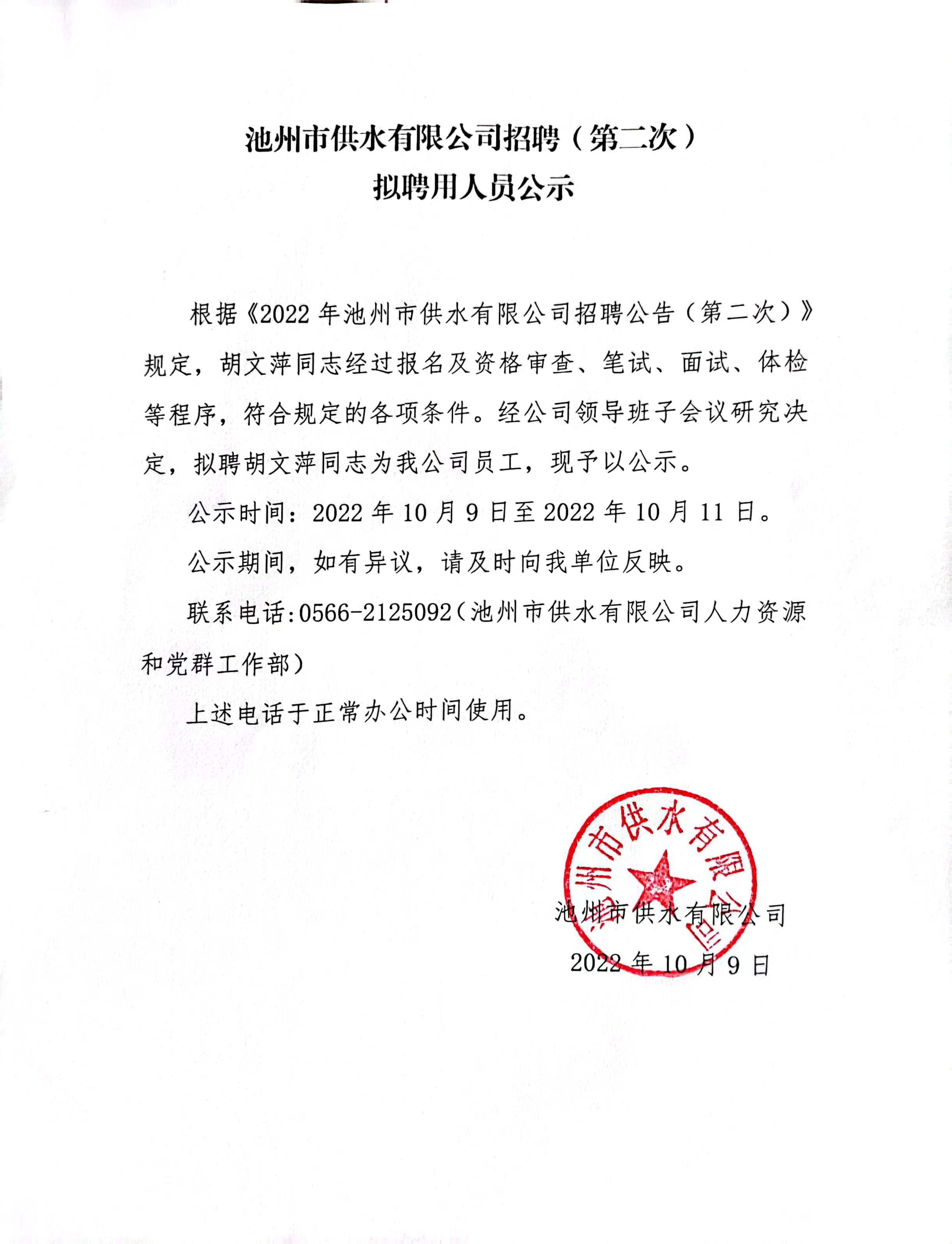 | 池州市供水有限公司招聘(第二次)擬聘用人員公示 | |