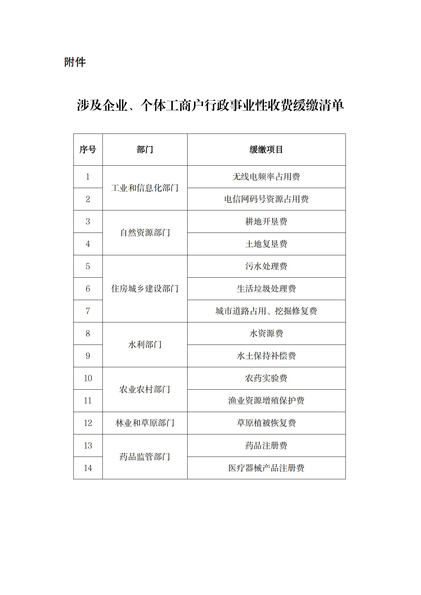 | 關于緩繳涉及企業(yè)、個體工商戶部分行政事業(yè)性收費的公告 | |