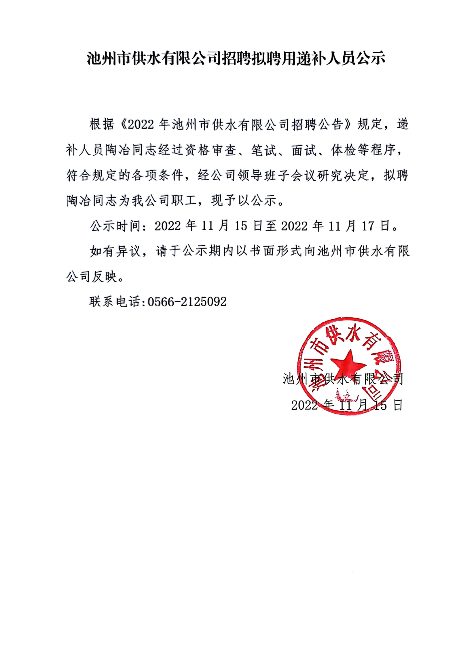 | 池州市供水有限公司招擬聘用遞補(bǔ)人員公示 | |