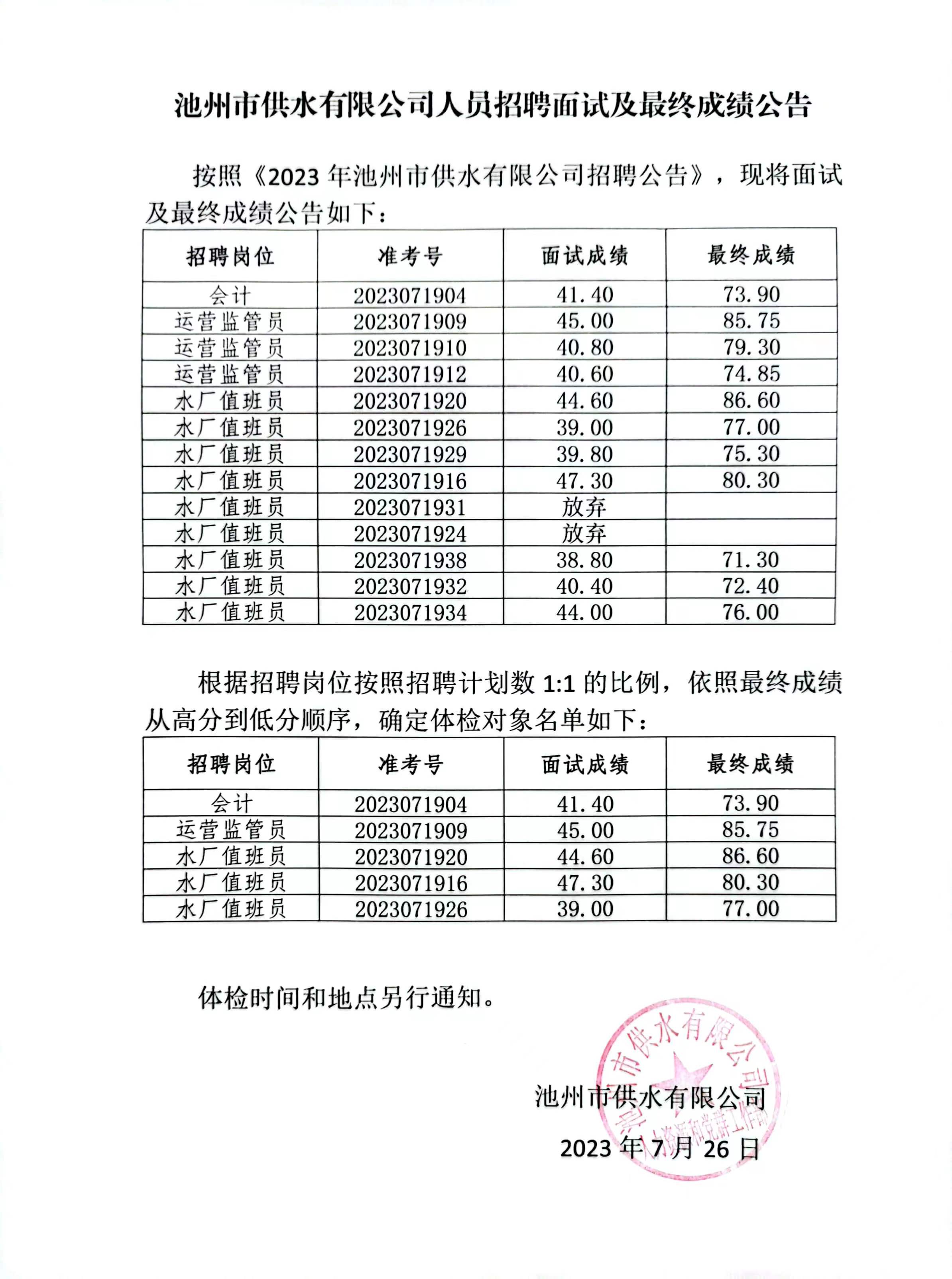 | 池州供水公司人員招聘面試及最終成績(jī)公告 | |