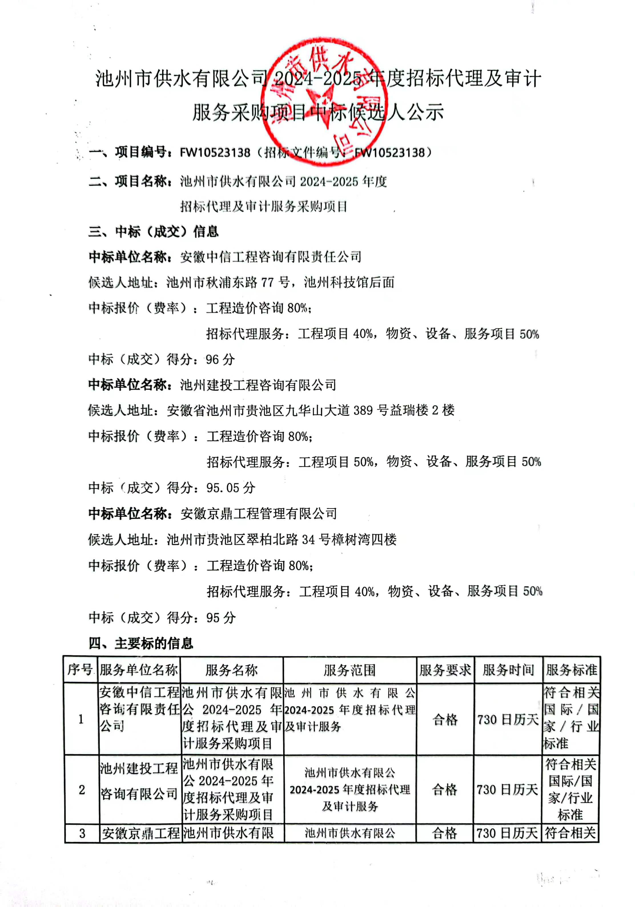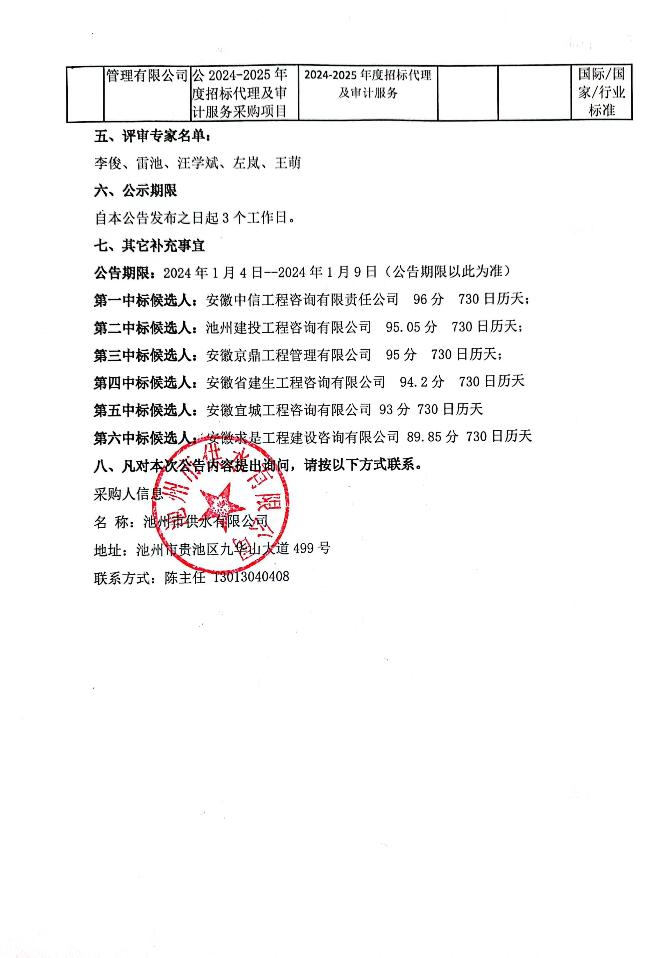 | 池州市供水有限公司招標代理及零星項目審計服務(wù)采購項目中標候選人公示 | |