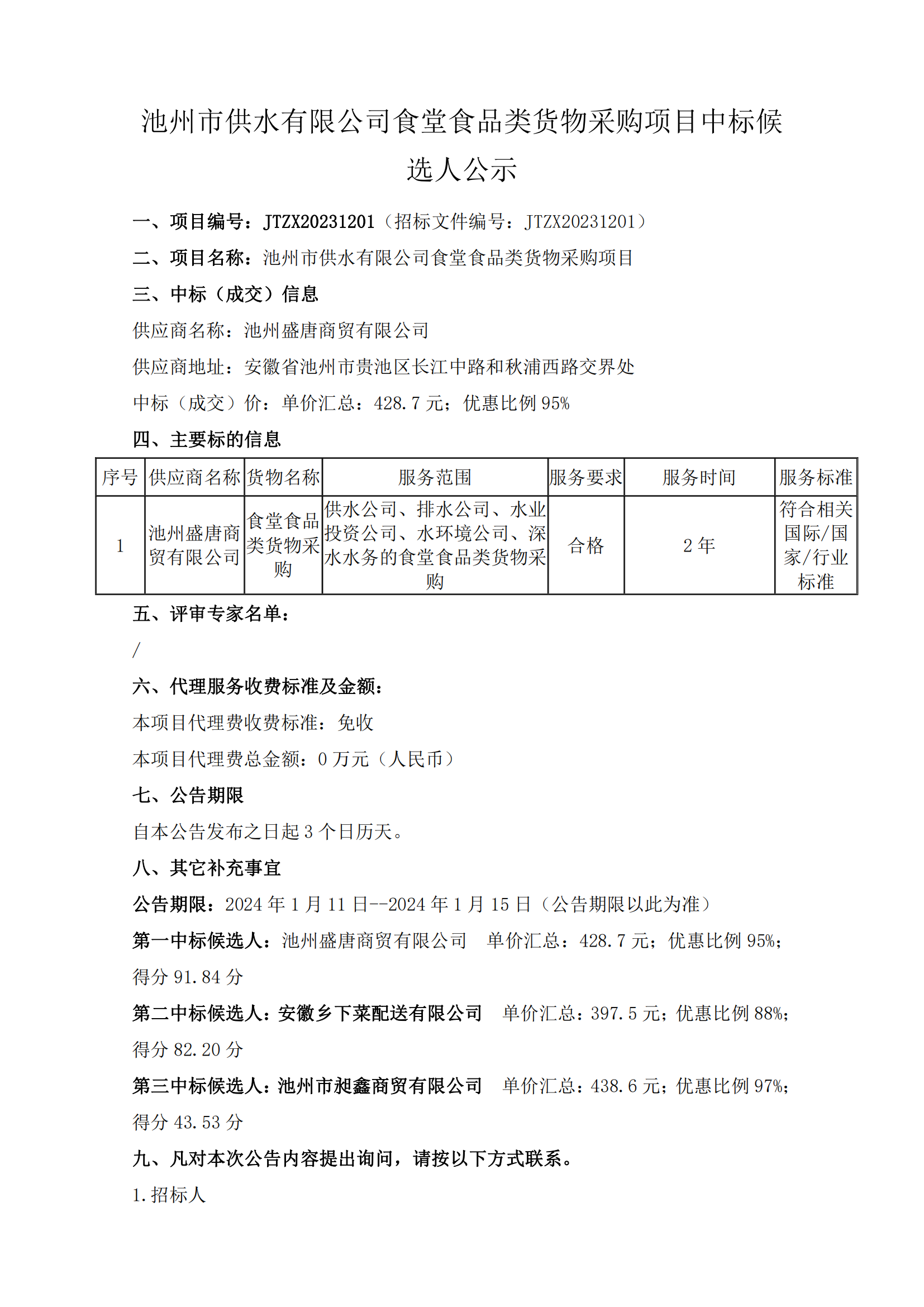 | 池州市供水有限公司食堂食品類貨物采購(gòu)項(xiàng)目中標(biāo)候選人公示 | |
