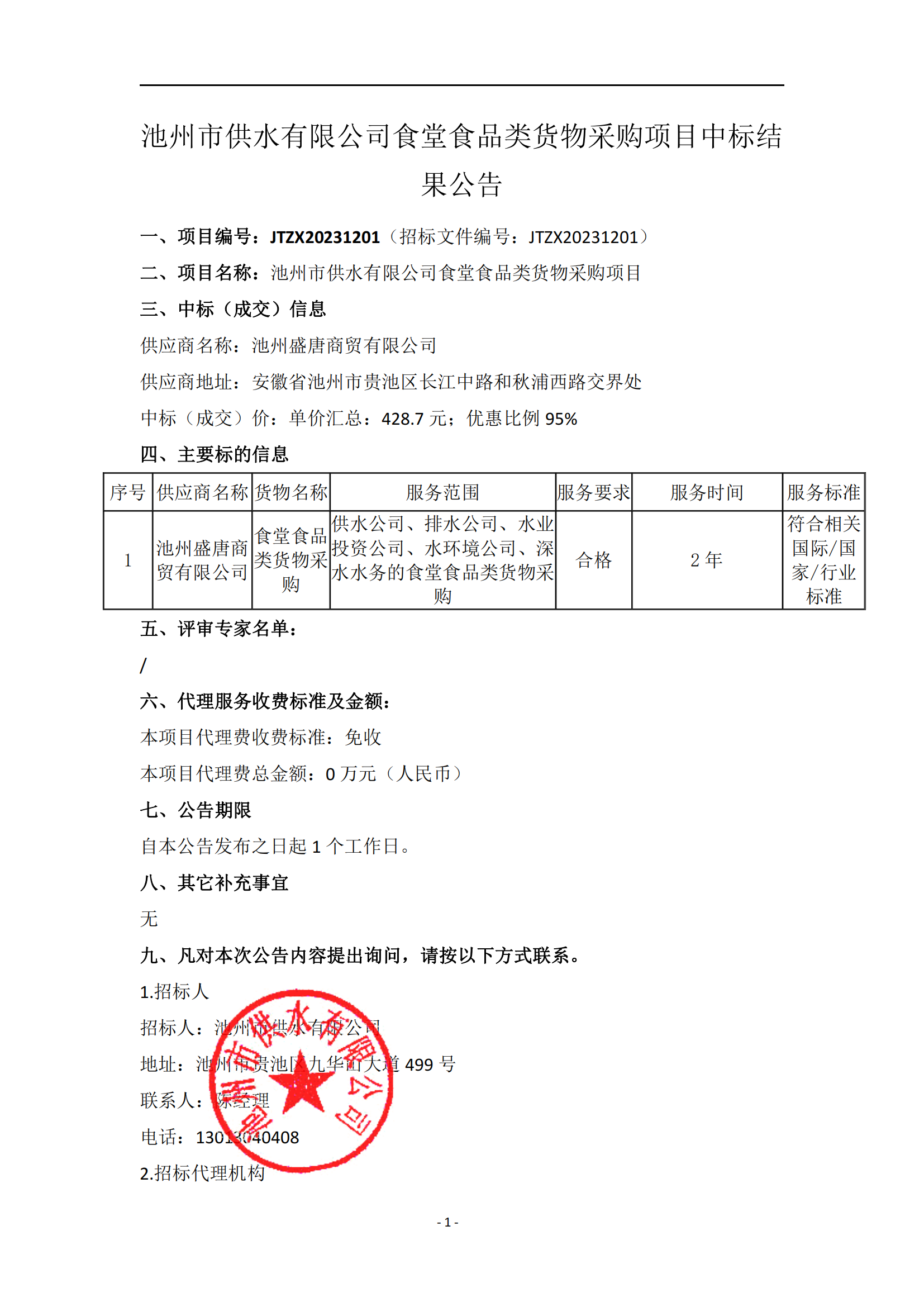 | 池州市供水有限公司食堂食品類貨物采購(gòu)項(xiàng)目中標(biāo)結(jié)果公告 | |
