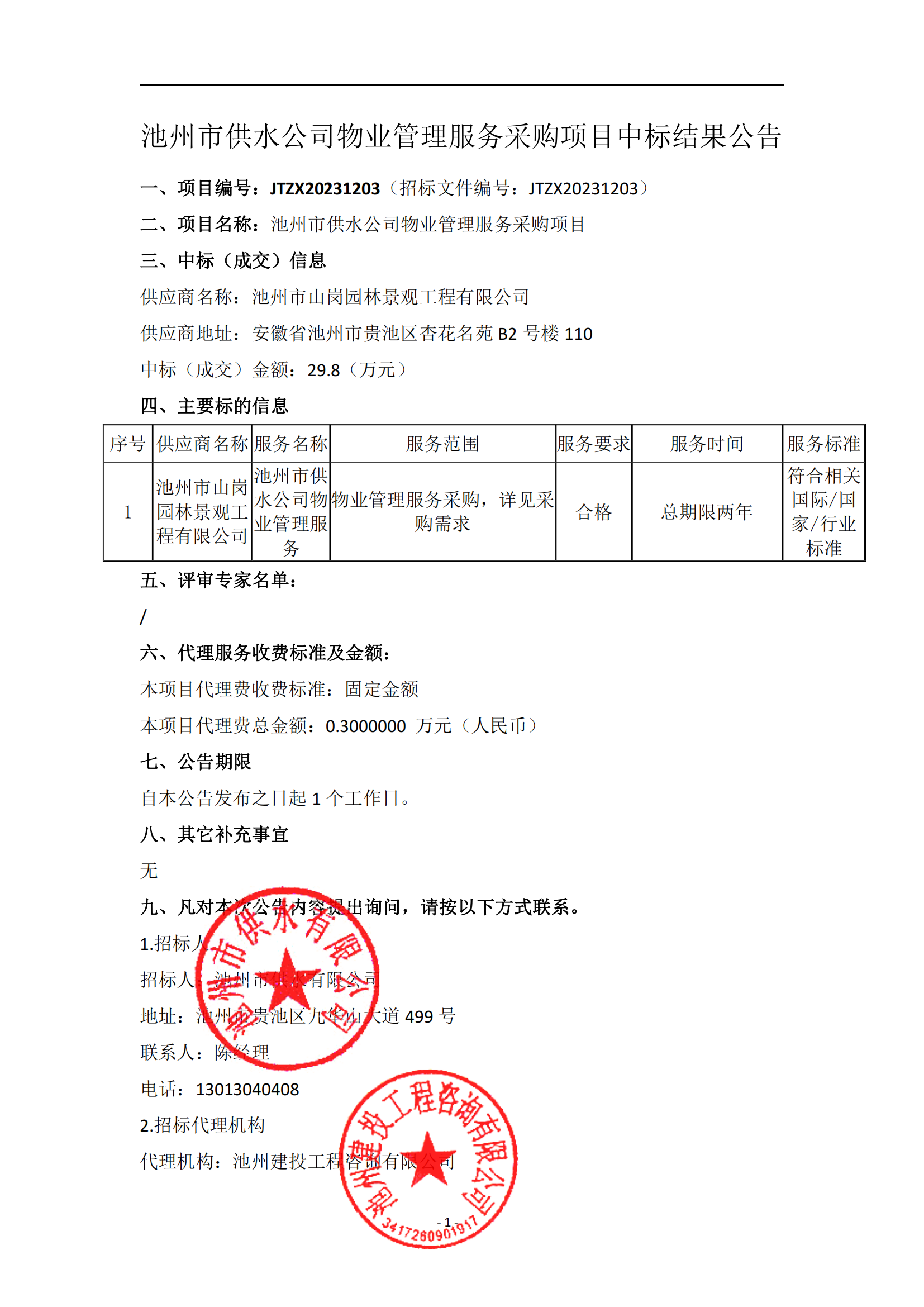 | 池州市供水公司物業(yè)管理服務(wù)采購項目中標結(jié)果公告 | |