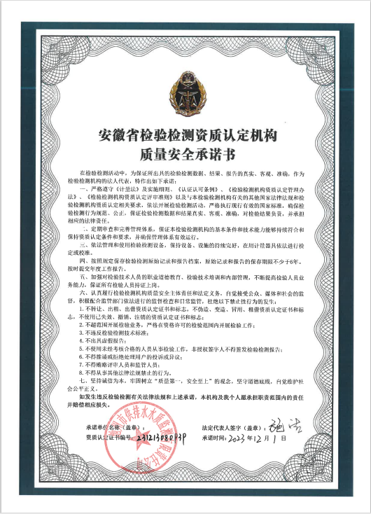 | 池州市供排水水質監(jiān)測有限責任公司質量安全承諾書 | |