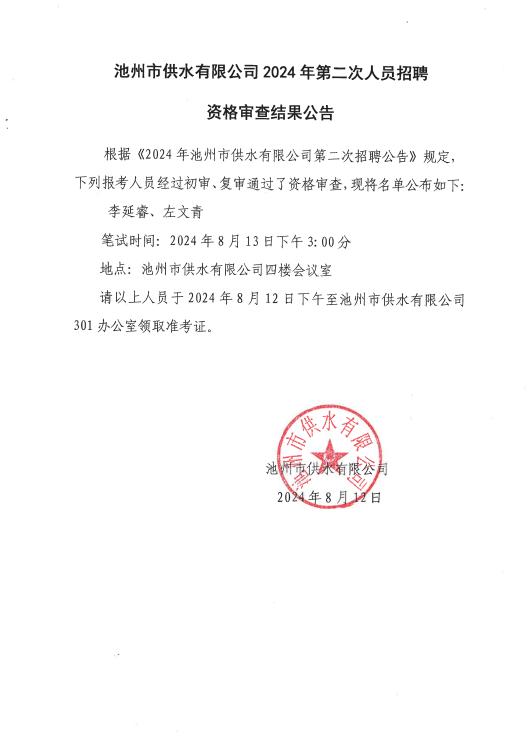 | 池州市供水有限公司2024年第二次招聘資格審查結(jié)果公告 | |