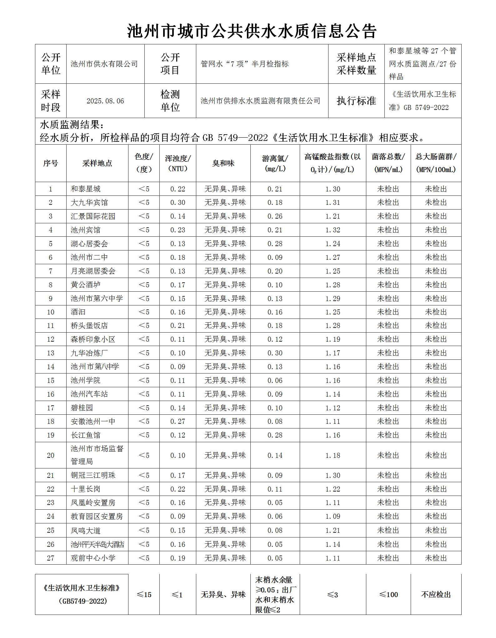 | 池州市城市公共供水水質(zhì)信息公告管網(wǎng)水“7項”半月檢指標20250806 | |