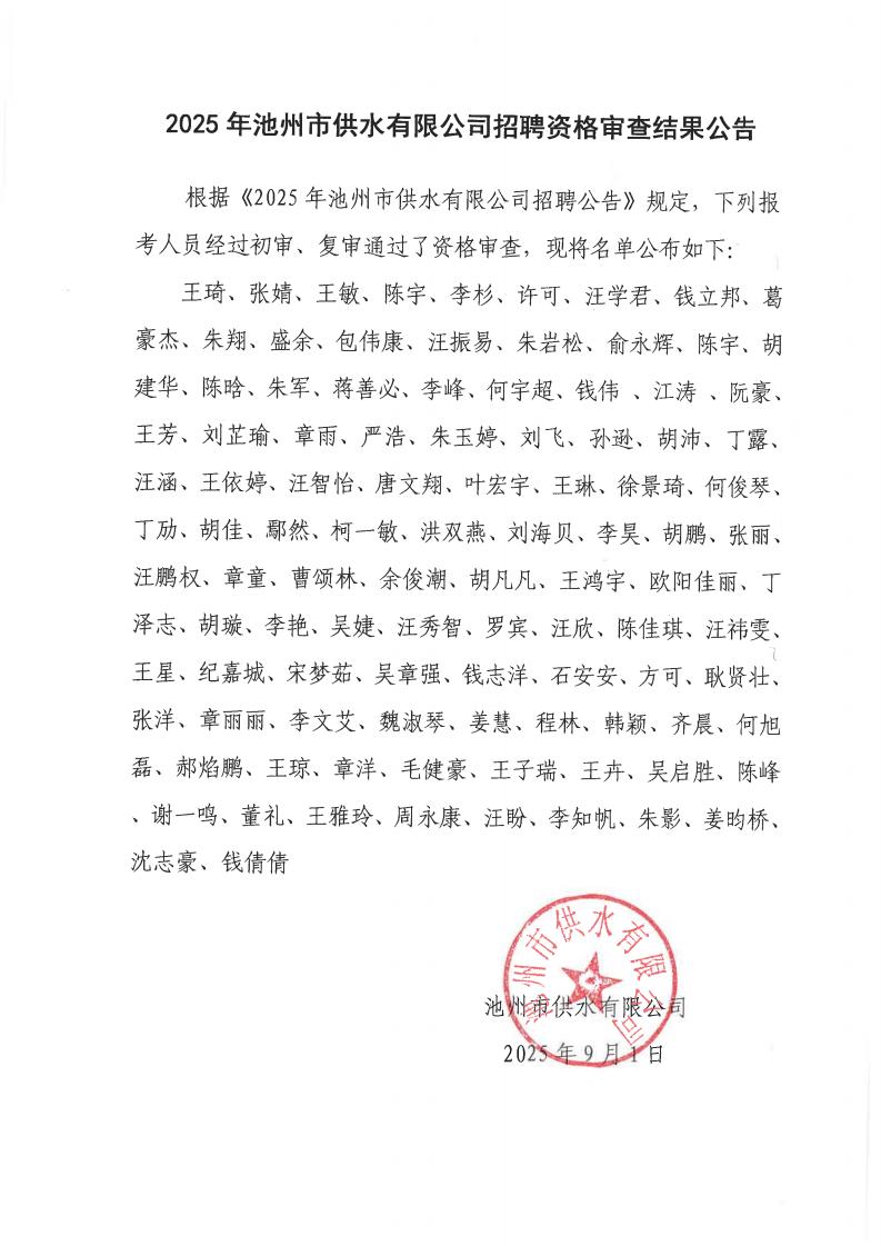 | 2025年池州市供水有限公司招聘資格審查結果公告 | |