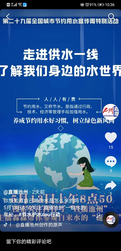 抖音直播 為了讓更多不能來現(xiàn)場實(shí)地參觀的市民們能近距離觀看制水過程,公司還邀請(qǐng)了今日頭條、安徽新聞網(wǎng)工作人員,利用抖音直播方式實(shí)現(xiàn)實(shí)時(shí)直播“民生水廠開放日”活動(dòng)。這一線上直播方式是當(dāng)下民眾的新寵,他們可以足不出戶就能親臨現(xiàn)場,甚至比在場觀眾更能看到細(xì)微和整體。今日頭條“直播池州”和安徽新聞“今日池州”兩大直播平臺(tái)受眾多、影響大,傳播速度快,是池州本地最受歡迎的網(wǎng)絡(luò)媒體。本次線上直播共吸引受眾1.5萬余人現(xiàn)場觀看、點(diǎn)評(píng),大大提升了池州供水知名度和“節(jié)水意識(shí)”的傳播。