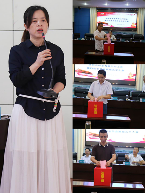 大會表決通過了《池州市供水有限公司第三屆工會委員會工作報告》和《池州市供水有限公司第三屆工會委員會財務(wù)報告》,并通過了監(jiān)票人、計票人、唱票人名單,大會采用無記名投票的方式選舉產(chǎn)生了新一屆工會委員:施潔(工會主席)、章超、劉朝輝、包亮、汪華穎;新一屆工會經(jīng)費審查委員會:趙情(主任)、黃曉芬、左嵐。新當(dāng)選的工會主席施潔同志進(jìn)行了表態(tài)發(fā)言。