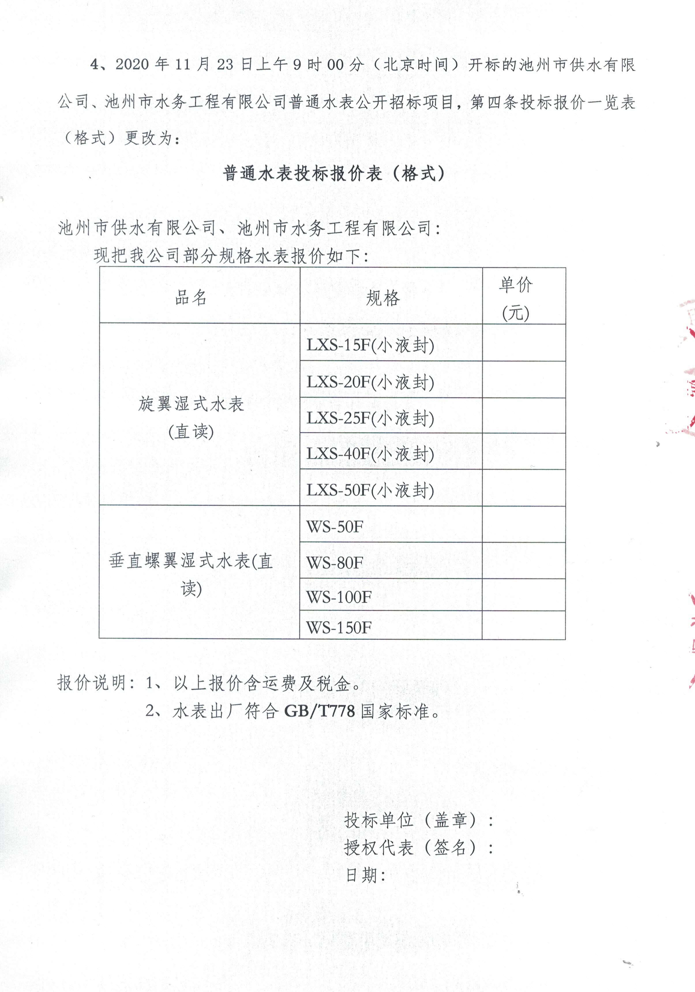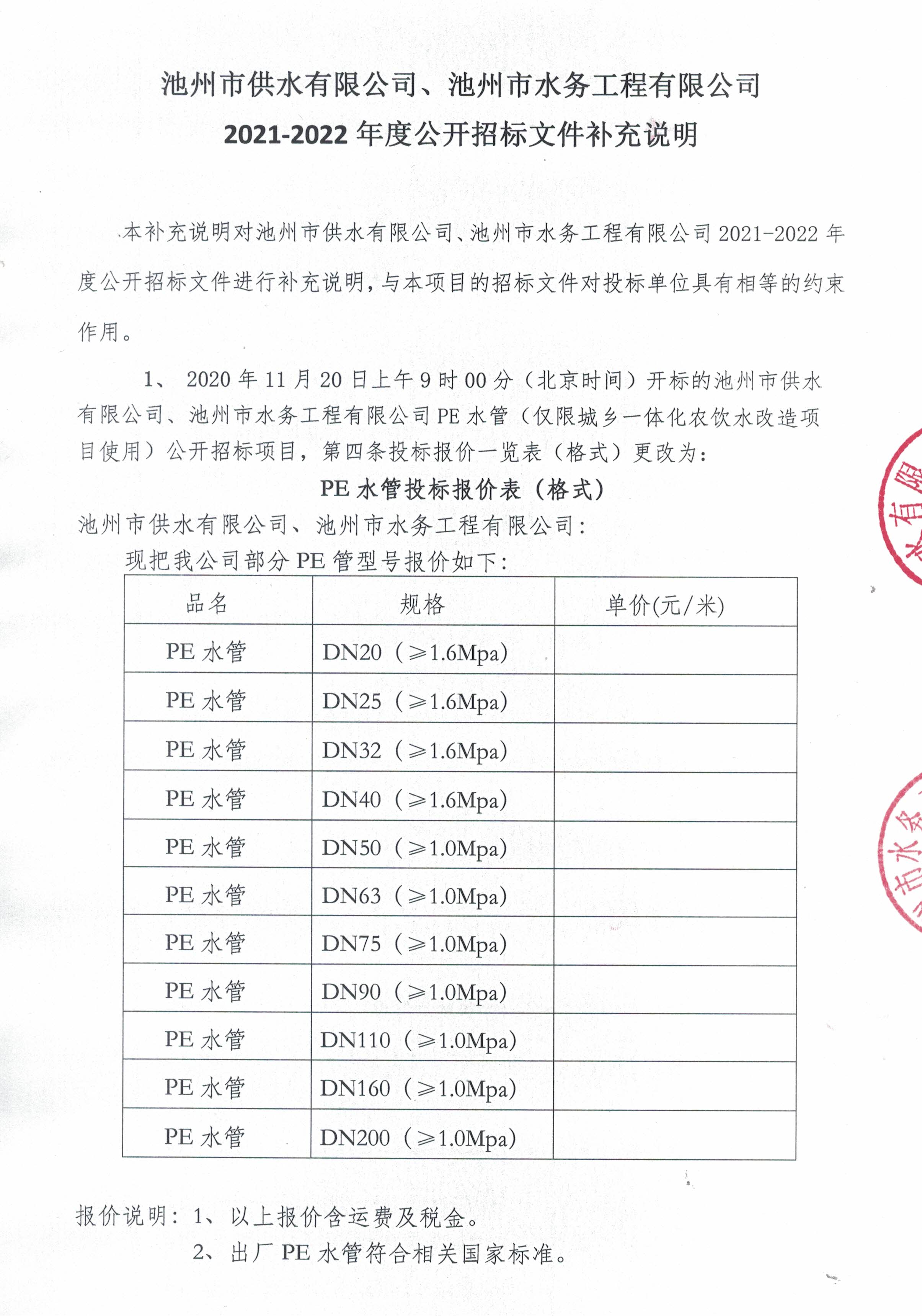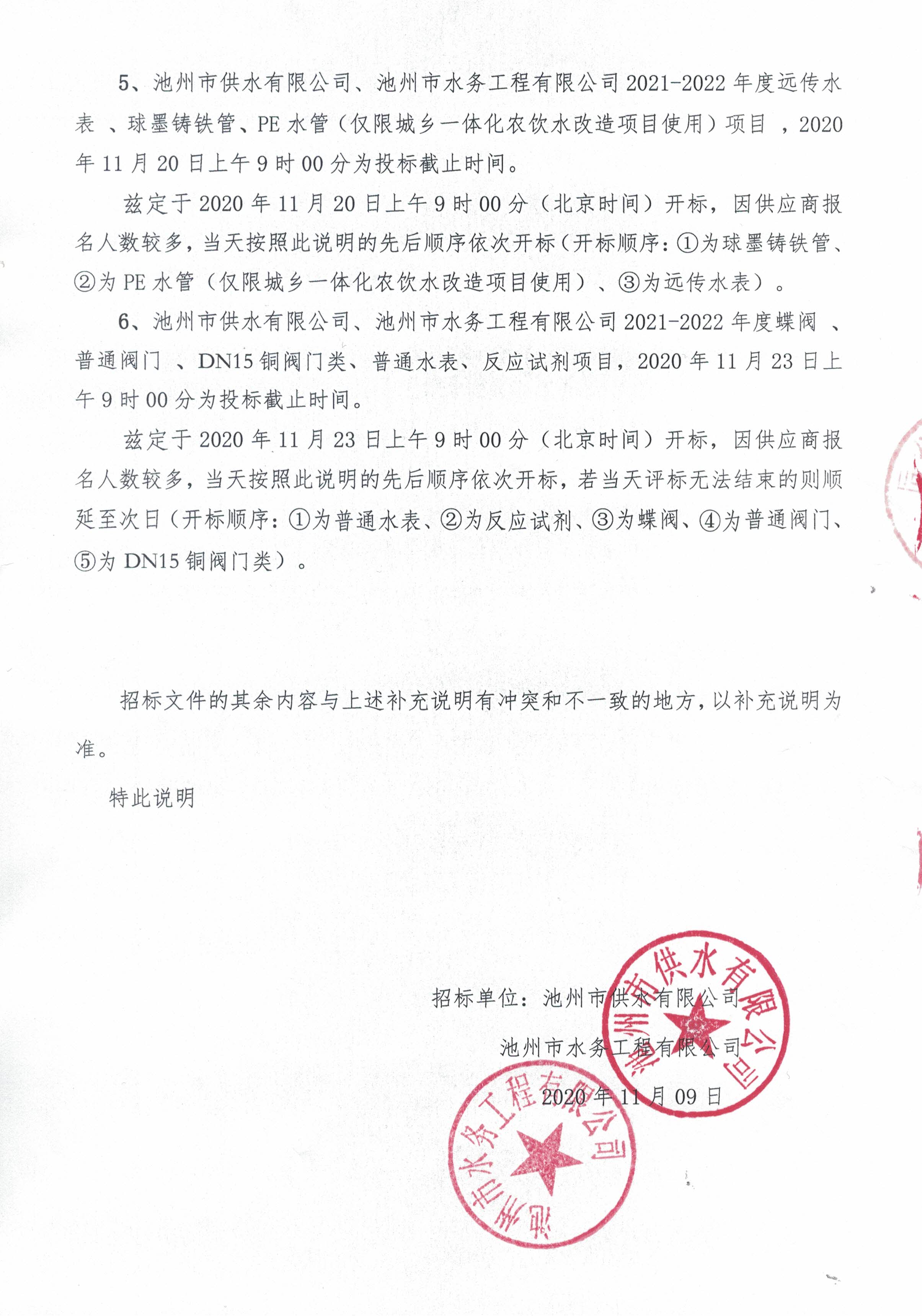 | 池州市供水有限公司、池州市水務(wù)工程有限公司 2021-2022年度公開(kāi)招標(biāo)文件補(bǔ)充說(shuō)明 | |