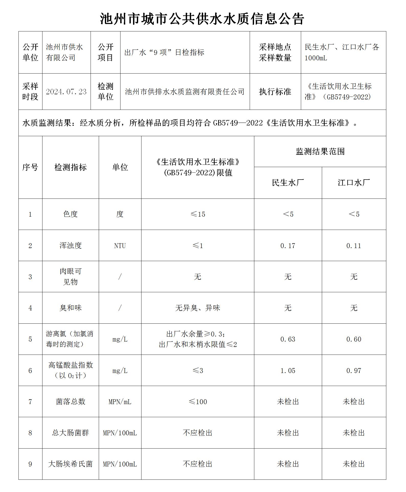 | 池州市城市公共供水水質信息公告出廠水“9項”日檢指標2024.07.23 | |