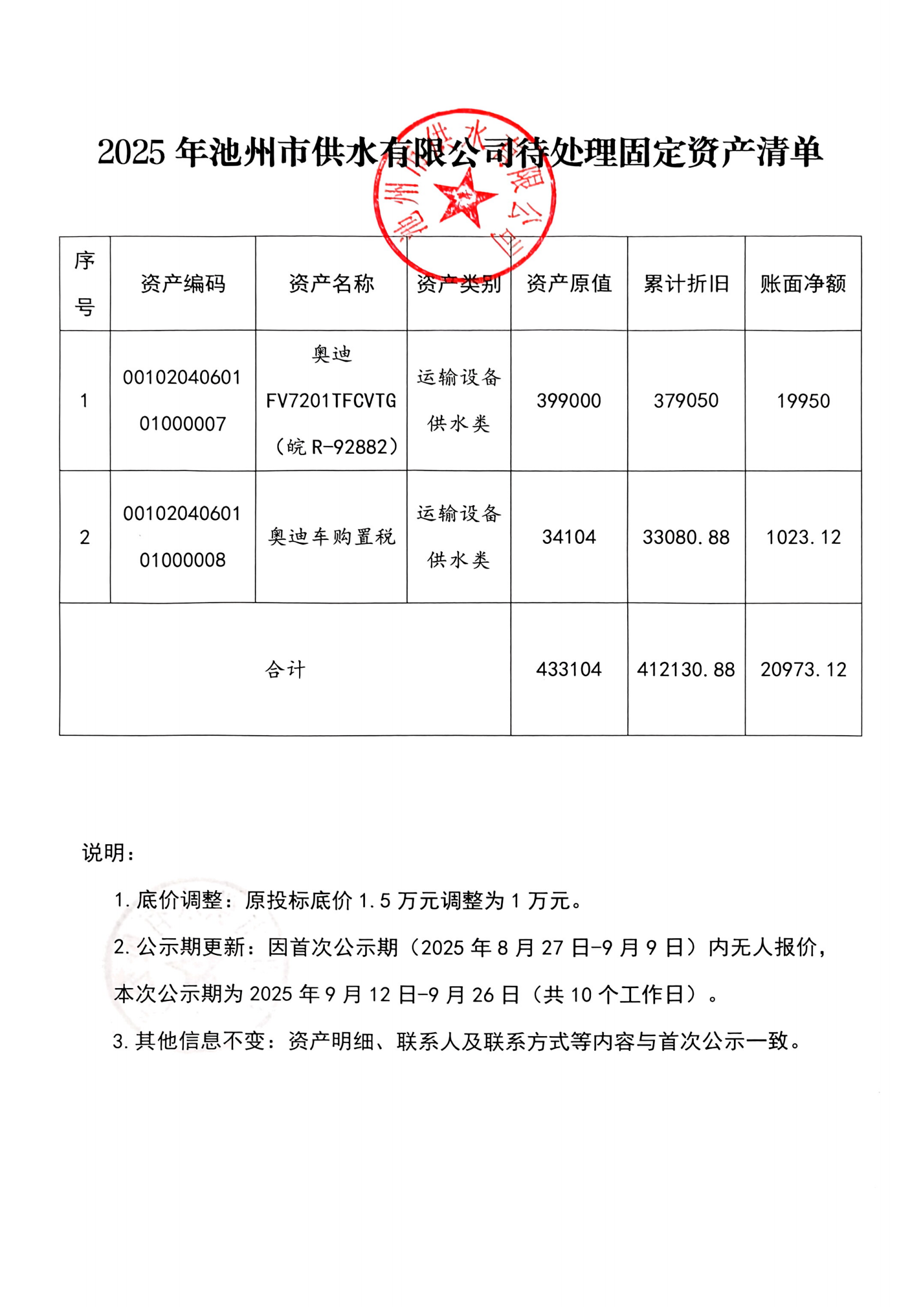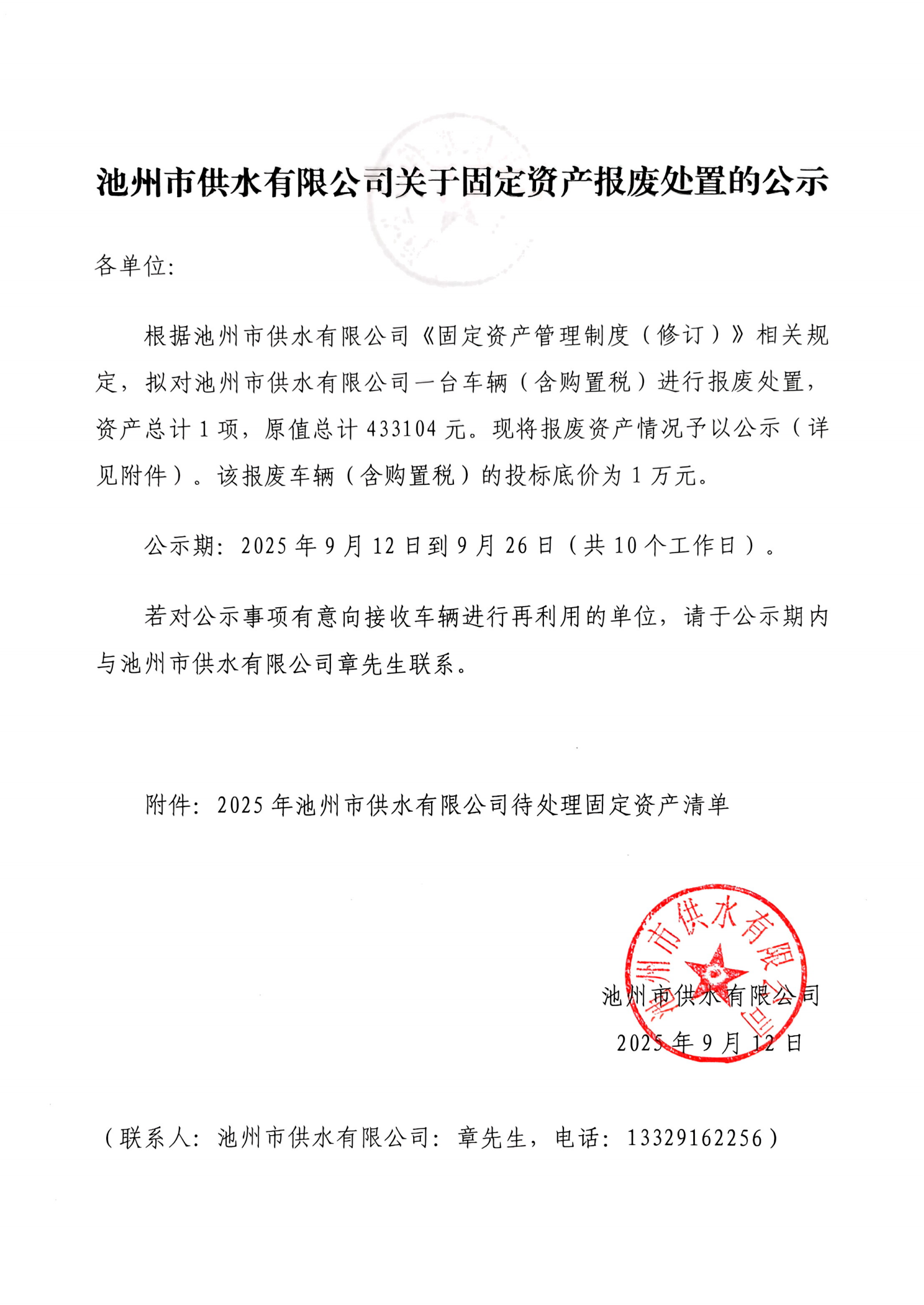 | 池州市供水有限公司關(guān)于固定資產(chǎn)報(bào)廢處置的公示 | |